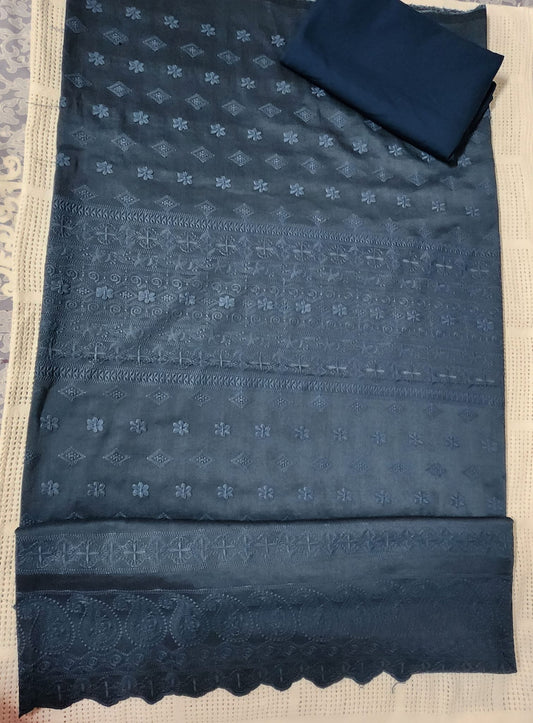 Blue Schiffli Rayon Dress Material with Tone to Tone Embroidery Work