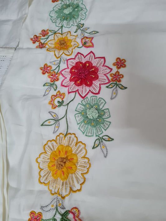 Floral White Muslin Silk 3 Piece Suit with Handwork